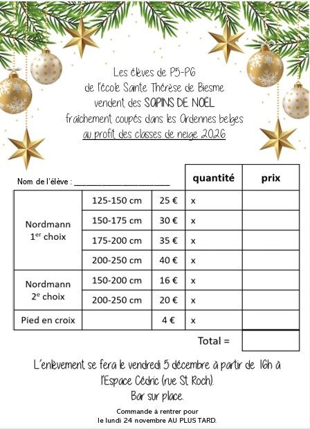 Les élèves de P5-P6 vendent des SAPINS DE NOËL fraîchement coupés dans les Ardennes belges au profit des classes de neige 2026.